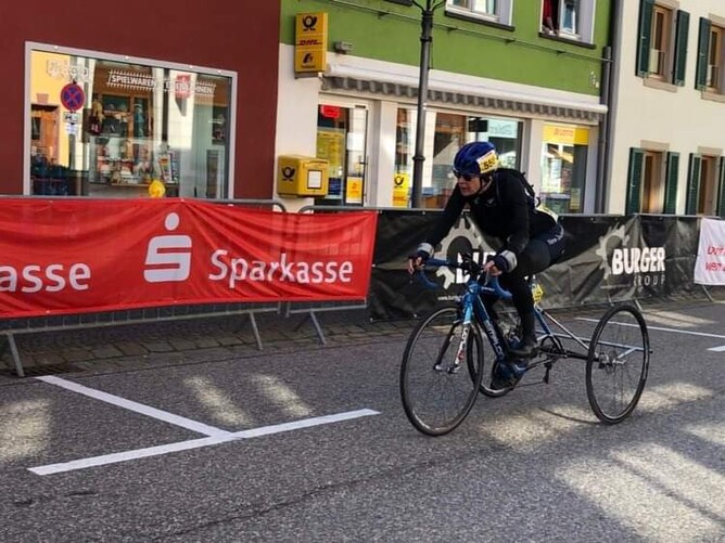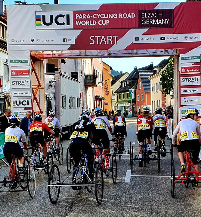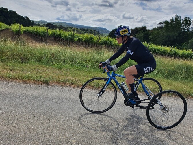 First race was again a Time Trial, a slight uphill course which is just my kind of course, but unfortunately after a great first half, I suffered a bad attack of ataxia, and got to hit the crash barrier 3 times, as I was unable to steer properly, but managed to just keep pedalling and finish - ahead of the World Champion. It was a bit of a surprise as the last couple of km, I just crawled to the finish. Another silver medal.