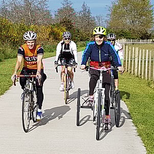 Despite doctors’ scepticism she was introduced to riding a tricycle in the velodrome in Cambridge by Michael Bland, with friends running alongside in the event that she fell over, eventually starting to ride outside, then achieving a successful ride to a Cambridge café.